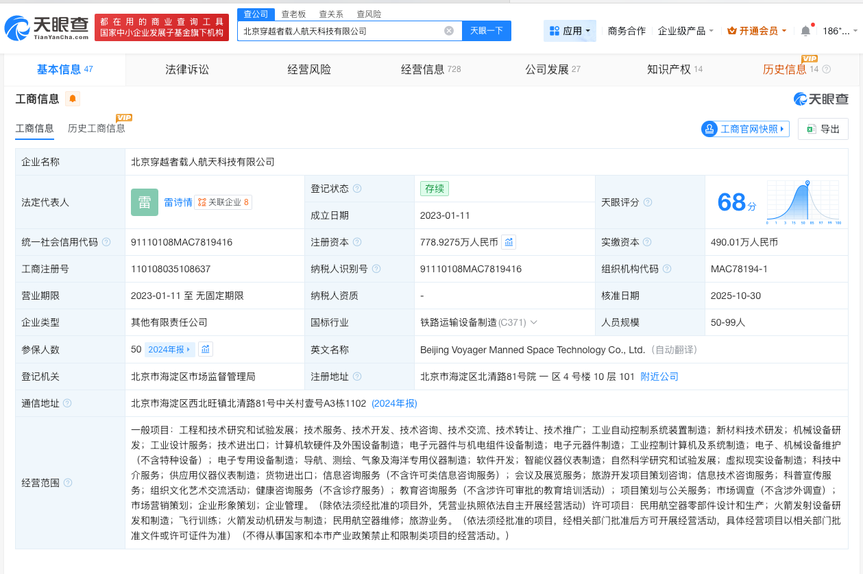 天眼查工商信息显示,“穿越者壹号(CYZ1)”关联北京穿越者载人航天科技有限公司成立于2023年1月,法定代表人为雷诗情,注册资本778.9万人民币,经营范围包括民用航空器零部件设计和生产、火箭发射设备研发和制造、飞行训练、火箭发动机研发与制造、民用航空器维修等。股东信息显示,该公司由雷诗情、谢萌、海南银汉逐梦科技中心(有限合伙)等共同持股。变更记录显示,2025年该公司曾多次增资。