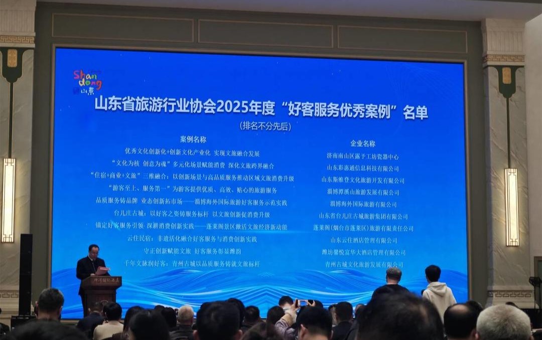 1月21日,山东省旅游行业协会六届二次会员代表大会暨2026年年会在德州齐河坤河国际酒店举行。会上公布了山东省旅游行业协会2025年度“好客服务优秀案例”名单,淄博潭溪山旅游区凭借《“游客至上,服务第一”为游客提供优质、高效、贴心的旅游服务》案例成功入选。